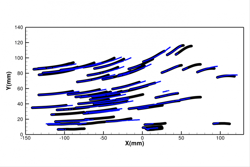 Comparaison entre les trajectoires de particules solides (diamètre 200 microns et densité 1,2) en bleu et les trajectoires des particules fluides (obtenues par intégration) en noir, dans un écoulement de type mascaret.