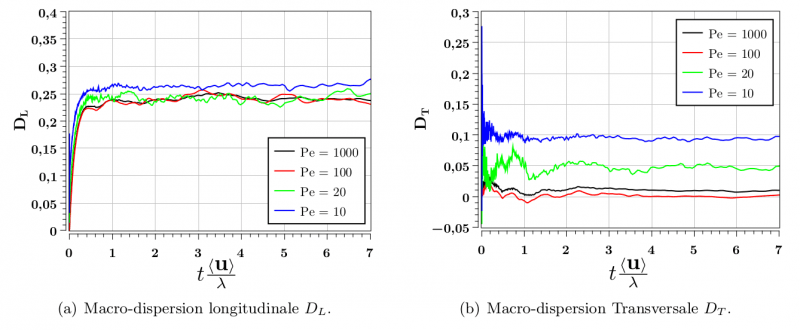 Evolution temporelle des macro-dispersions, longitudinale et transversales pour différentes valeurs du nombre de Péclet avec une même hétérogénéité du milieu poreux 3D.