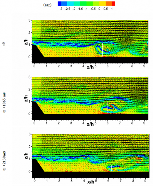 La finalité de ce travail de thèse qui a été mené par Souria Hamidouche a été d’appréhender les différents mécanismes et processus hydrodynamiques générés par la présence de la dune et qui sont susceptibles d’influencer son évolution morphodynamique. A partir de techniques de mesure optiques globales type PIV (Particle Image Velocimetry), de ses évolutions (PIV stéréoscopique, tomographie) et d’outils d’analyses de données instationnaires, la topologie et la dynamique de l’écoulement généré au-dessus d’une ride fixe sont détaillées afin de pouvoir identifier les effets de la vorticité sur le transport et la migration de la dune.