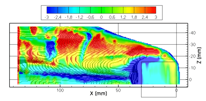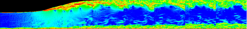 Champ de FTLE pour un mascaret déferlant (Fr=1,55). Les zones bleues représentent des zones de l'écoulement pour lesquelles les trajectoires des particules fluides sont stables. Les zones rouges représentent des zones où les trajectoires de particules sont instables.
