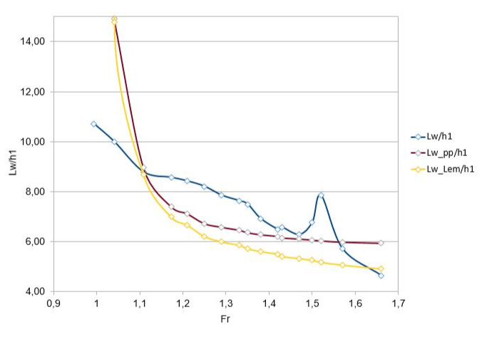 Paramètre caractérisant la surface libre Lw/h1 en fonction du nombre de Froude Fr (bleu: OPENFOAM, jaune: théorie de Lemoine et rouge: théorie de Lemoine simplifiée).