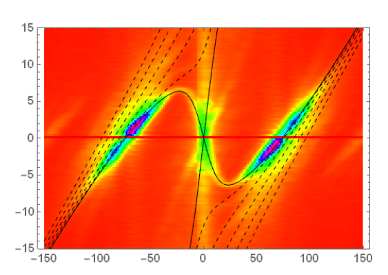 Schématisation des interactions houle-courant. Racine carrée du spectre de puissance des fluctuations de surface libre superposée à la relation de dispersion des vagues (ligne continue noire ; les courbes en pointillés noirs correspondent aux modes transverses du canal).