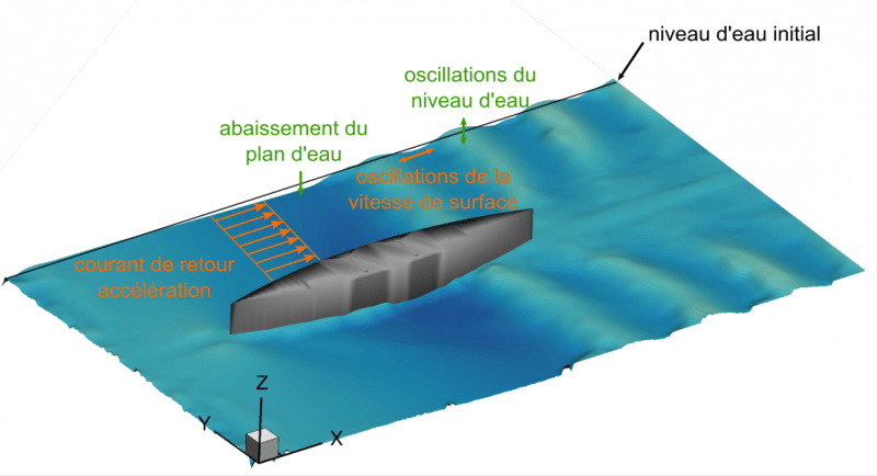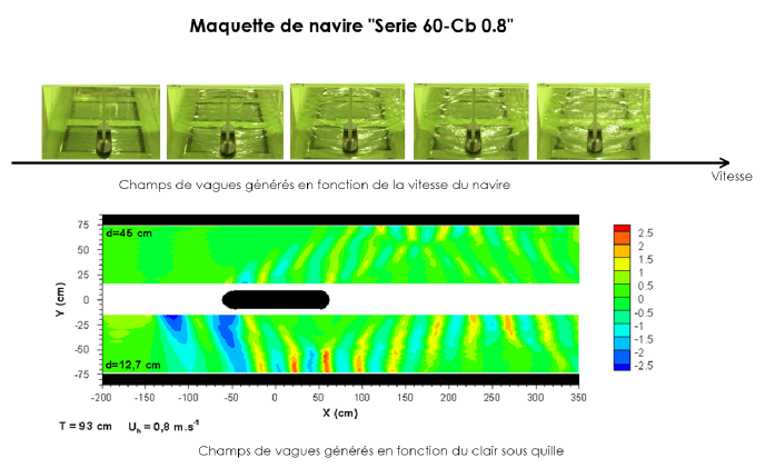 La hauteur de la vague générée par les embarcations est causée par différents facteurs notamment, la vitesse, la distance de la rive, la profondeur de l’eau. L’objectif de l’étude est d’identifier les principaux facteurs de déstructuration des berges. La hauteur de la vague est un des éléments les plus importants dans l’érosion des rives. Afin d’appréhender cette problématique, il est indispensable d’analyser les processus responsables de l’érosion des berges par les ondes de batillage. Par des mesures de hauteurs de la surface libre, de vitesse et de pressions sur les berges, une étude expérimentale, menée au sein du bassin des carènes de l’Institut Pprime, permet d’étudier les mécanismes de développement des ondes de batillage et les forces qu’elles génèrent sur les berges pour des caractéristiques de navires définies, des conditions hydrodynamiques, et de la morphologie des berges et du chenal. Cette étude, menée lors du travail de thèse de Guillaume Gomit, a pour finalité d’apporter une caractérisation fine des évolutions spatiales et temporelles des ondes générées et des courants induits en navigation fluviale. Par des mesures couplées des vagues et des vitesses de l’écoulement, nous avons accès à une description fine des ondes liées à la navigation et de leurs impacts sur les berges, en fonction de paramètre propre à leurs évolutions dans des fleuves, rivières et canaux.