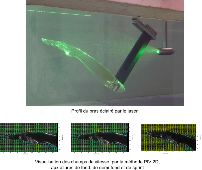 Il apparaît que les forces propulsives dépendent fortement de l’évolution spatio-temporelle des structures tourbillonnaires et, en conséquence, de la cinématique de la main et de l’avant-bras. Ces travaux s’effectuent en collaboration avec l’axe ROBIOSS (D3), l’Université des Sciences appliquées d’Amsterdam, ainsi que la Fédération Française de Natation.