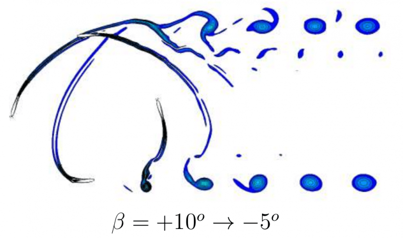 L’axe HydÉE a travaillé sur des éoliennes à partir de méthodes particulaires de type SPH dans le cadre d’une CIFRE avec la société NOVEOL et développe aujourd’hui une hydrolienne capable de fonctionner à des vitesses de rotation réduites tout en contrôlant ses lâchers tourbillonnaires dans le but de maximiser le couple produit et de minimiser ses nuisances sur l’environnement. Ces travaux ont permis de déterminer une famille de lois de commande de l’incidence des pales permettant d’éviter la création de tourbillons dans l’écoulement sous l’hypothèse de fluide parfait. Ces lois ont été appliquées en fluide réel de manière à déterminer les gammes de paramètres en permettant l’exploitation dans le contexte de la récupération d’énergie. En particulier, le phénomène de décrochage dynamique est évité grâce afin de bénéficier d’un fonctionnement propulsif sur une plage étendue, grâce à la définition d’une incidence dynamique respectant la condition de conservation de la circulation. L’association de lois de commandes complémentaires permet alors d’augmenter le rendement de l’hydrolienne et d’autoriser les lâchers tourbillonnaires résiduels en des points imposés et à des intensités déterministes.