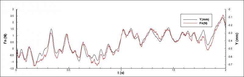 Evolution temporelle du signal de déplacement vertical du profil et de la composante verticale des efforts.