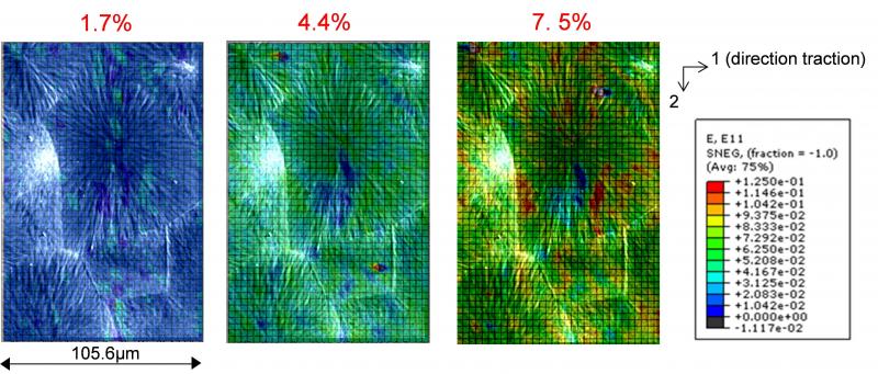 Evolution des champs de déformation mesurés par corrélation d’images numériques sous MEB dans un polypropylène en traction à différents niveaux de déformation macroscopique (direction de traction).