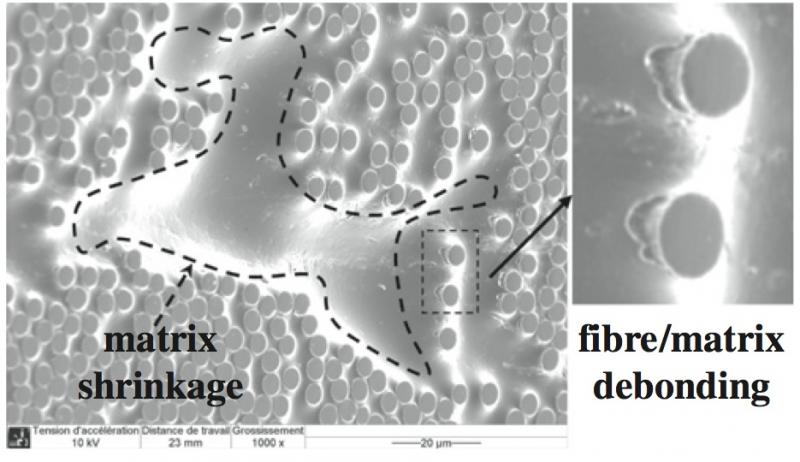 Les activités de l’axe sur les matériaux composites à matrice organique (thermodurcissable ou thermoplastique) portent sur la compréhension, l’identification et la modélisation de leurs mécanismes de déformation et d’endommagement dans des conditions de sollicitations voisines de leur usage et avec une attention particulière portée au lien entre les mécanismes aux échelles micro/mésoscopiques et le comportement mécanique macroscopique. Avec l’objectif de proposer des modèles prédictifs de résistance ou de durée de vie, l’une des spécificités de notre approche est de prendre en compte les effets de l’environnement (température, humidité, gaz réactif ou non…) qui se traduisent par des couplages multiphysiques au sein de la matière (entre diffusion, réaction chimique, visco-élasticité…) et des gradients ou transitoires qui influencent la durabilité des composants.