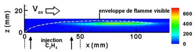 Flammes de Diffusion de Type Couche Limite en Micropesanteur : La configuration qui s’avère être la plus représentative d’une situation d’incendie dans un tel contexte correspond à l’établissement d’une flamme non-prémélangée dans une couche limite oxydante développée au-dessus d’une plaque plane combustible. Ayant constaté que par ailleurs les transferts radiatifs jouent un rôle prépondérant sous gravité réduite, des études ont été entreprises sur la modélisation numérique de la cinétique de formation et d’oxydation des suies s’appuyant sur les résultats expérimentaux. Le calcul du champ de la fraction volumique de suie et le nombre de particules passe par résolution de deux équations de transport (convection/ diffusion). Les HAP (Hydrocarbures Aromatiques Polycycliques) sont considérés comme précurseur de la nucléation, et les espèces chimiques intermédiaires comme C6H6, C6H5, C2H2, H2, OH, etc.,sont prises en compte pour le processus de croissance, d’agglomération et d’oxydation.