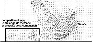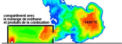 Risques d’Inflammation d’Imbrûlés lors d’un Incendie en Espace Confiné : Le feu en espace confiné sous-ventilé, est contrôlé par un grand nombre de paramètres, tels que la disposition des objets inflammables, et le type du combustible, ainsi que la quantité d’oxygène. La flamme s’éteint par manque de comburant avant d’avoir consommé tout le combustible présent, la dépression qui découle du refroidissement des gaz brûlés provoque une entrée d’air en cas de présence d’une ouverture, favorisant le mélange combustible/air. Les gaz du combustible imbrûlé, en contact avec l’air, s’enflamment dans des limites d’inflammation. Lorsque l’intensité du feu est importante au point d’augmenter rapidement la pression suite à l’augmentation de la température des gaz brûlés, la situation revient à celle d’un feu éjecté vers l’extérieur avec des vitesses importantes, c’est un phénomène de retour de flamme (backdraft).