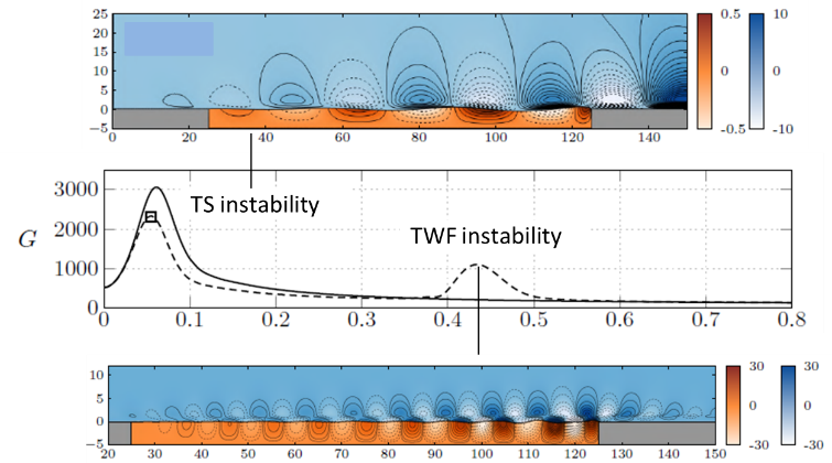 Pour finir la présentation, je m’intéresserai au problème du contrôle passif des ondes de Tollmien-Schlichting (TS) se développant dans des couches limites sur paroi rigide en introduisant un matériau visco-élastique de longueur finie. En particulier, j’introduirai le formalisme du résolvent aéroélastique permettant d’évaluer l’atténuation des ondes TS à basse-fréquence et d’anticiper l’apparition d’ondes de flottement (TWF)  à plus haute fréquence, comme illustré sur la figure ci-jointe.