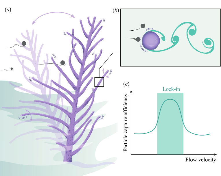 Les coraux mous, tels que le panache marin bipenné Antillogorgia bipinnata, sont des animaux qui forment des colonies et se nourrissent en attrapant les particules de nourriture apportées par les courants. Grâce à leur squelette flexible en forme d’arbre, ils se plient et se balancent d’avant en arrière avec la houle. En plus de ce balancement à basse fréquence de toute la colonie, les branches d’A. bipinnata vibrent à haute fréquence avec une faible amplitude. Nous montrons que les tourbillons lâchés dans le sillage de la colonie corallienne sont probablement responsables de ces vibrations. Pour évaluer l’impact de la dynamique sur l’alimentation par filtration, nous simulons des particules advectées par l’écoulement autour d’un cylindre circulaire et calculons le taux de capture avec un solveur d’interaction fluide-structure. Nous observons que les cylindres vibrants peuvent capturer jusqu’à 40% de particules en plus que les cylindres fixes. Les vibrations induites par les tourbillons (VIV) améliorent vraisemblablement la capture de nourriture par les coraux mous. De même, la dispersion/capture du pollen et la dispersion des graines sont probablement affectées par les VIV.
