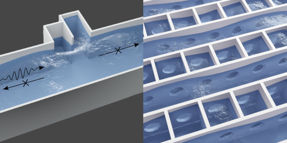 Pour répondre à ces défis, notre équipe a développé des systèmes innovants inspirés de concepts issus d’autres domaines des ondes, tels que l’acoustique ou l’optique. Ces approches permettent de proposer des solutions plus compactes et respectueuses de l’environnement. Par exemple, l’utilisation de cavités résonantes, telles que des résonateurs de Helmholtz analogues, s’est révélée particulièrement efficace pour créer des barrières de protection contre les vagues ou pour apaiser des plans d’eau agités. Par ailleurs, les métamatériaux offrent la possibilité d’une forte redirection des vagues, ce qui peut être mis à profit pour protéger le littoral par exemple.