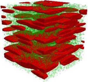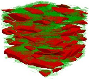 D'autre part, une forte activité porte sur les transferts en milieux poreux et/ou fracturés, avec une approche prenant en compte le détail des mécanismes et de la morphologie à l'échelle locale, afin de prédire les comportements macroscopiques. L'amélioration et l'extension des outils conceptuels et logiciels constituent une tâche de fond permanente et importante, recouvrant le développement d'outils et de méthodologies pour la caractérisation et la reconstruction stochastique de milieux hétérogènes (cf. figure 2) et l'étude systématique des propriétés topologiques et stéréologiques ainsi que des propriétés de transport dans des situations canoniques. On enrichit ainsi une base de connaissance concernant des situations modèles, susceptible d'être appliquée dans des contextes applicatifs très divers. Dans le même temps, on peut identifier les paramètres les plus pertinents et dégager des lois générales gouvernant les comportements. On traite également de questions encore ouvertes concernant des aspects théoriques de la formulation d'une description homogénéisée, notamment en présence de processus réactifs et de déséquilibres thermodynamiques locaux.