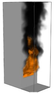 Concernant les mécanismes chimiques, les travaux expérimentaux autour de la dynamique d’un feu sont complétés par le développement de modèles de combustion permettant de capter par la simulation numérique les phénomènes physiques transitoires inhérents aux conditions sous ventilées. Conjointement, des travaux concernent le développement de modèles cinétiques de combustion non infiniment rapide et leur intégration au sein des codes de calculs, notamment Firefoam. Les modèles de types flamelettes sont retenus et développés, puis intégrés dans le code de calcul. Ce travail montrant l’enjeu d’une description précise des champs de températures, différents modèles de rayonnement sont également développés et caractérisés. Pour le moment des mécanismes cinétiques de la littérature sont utilisés, toutefois, le souhait est de développer des modèles cinétiques « squelettes » ou « réduits » dans les conditions caractéristiques des incendies en termes de richesse et de température afin d’être capable de prédire l’évolution des principaux gaz toxiques.