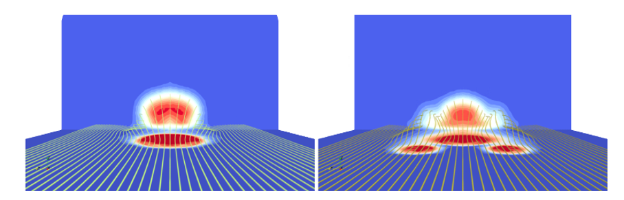 Des modèles sont développés sous OpenFOAM (volumes finis) et FlexPDE (éléments finis) pour simuler des écoulements de convection mixte instationnaires (bidimensionnels et tridimensionnels avec OpenFOAM, bidimensionnels avec FlexPDE). Un exemple de simulation OpenFOAM de l’écoulement de convection mixte autour d’un cylindre où celui-ci n’est chauffé qu’à partir de =60 s.