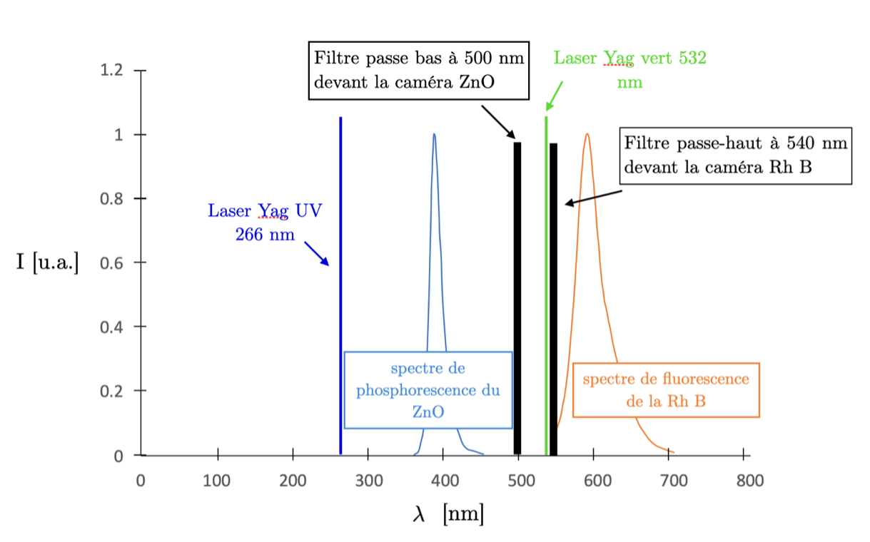 Une étude expérimentale sur le banc BATH est en cours pour déterminer une géométrie d’agencement de trous pour optimiser l’efficacité de refroidissement du film-cooling pour différents taux de soufflage M en diminuant l’impact des CRVP sur le mélange entre les deux fluides chauds et froids. Dans le cadre de cette étude une mesure de température dans le fluide par phosphorescence du ZnO est développée et mise en place sur le banc d’essai BATH. L’oxyde de Zinc (ZnO) se présente sous la forme de particules de 2 microns de diamètres qui ensemencent l’écoulement.