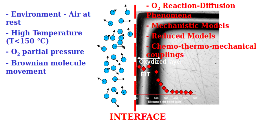 Les matériaux composites à matrice polymère (CMP) sont de plus en plus employés pour la réalisation de pièces structurelles d'avion, permettant une économie de poids constante et une réduction des émissions de CO2. –Une collaboration entre DPMM ENDO et FTC COST,se concentrant sur l'emploi de l'installation BATH sur le plateau technique Prometee, consiste à caractériser les couplages aéro-thermo-mécaniques se produisant lors du vieillissement par thermo-oxydation des composites à matrice polymère dans des conditions de flux d'air à grande vitesse et hautes températures. Les conditions à l'interface (gradients de vitesse du flux d'air, rugosité, rayonnement et flux de chaleur convectif, pression locale et concentration en O2) devraient jouer un rôle majeur. Une méthode inverse sera développée pour obtenir la température des échantillons de matériau CMP et le flux de chaleur de la paroi de l'arrière grâce aux mesures par thermographie infrarouge et par thermocouple. La Microscopie optique et la technique d’ultra-micro indentation seront employées pour caractériser l'érosion et les gradients de propriétés mécaniques dans la couche de matière thermo-oxydée. Des modèles numériques et des schémas d'optimisation seront utilisés pour simuler et identifier les champs aérothermiques proches de l'interface écoulement/matière (échanges convectifs) et les phénomènes de thermo-oxydation diffusion/réaction (paramètres diffusifs, constantes de réaction, constantes de couplage chimio-mécaniques) au sein du matériau. Les conditions aérothermiques identifiées comme la température, la pression, la concentration en oxygène près de l'interface écoulement-matière seront utilisées comme conditions aux limites pour simuler les gradients de thermo-oxydation au sein du matériau vieilli. Le lien entre propriétés d'interface et thermo-oxydation du matériau sera ainsi établi.