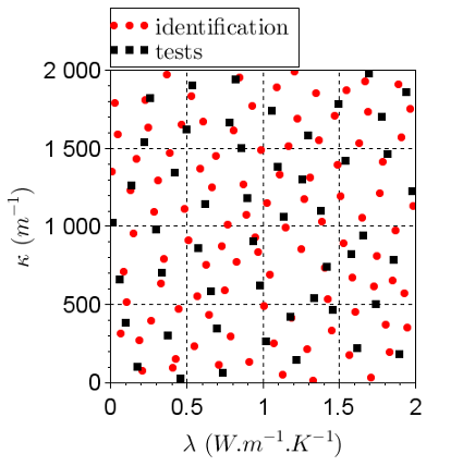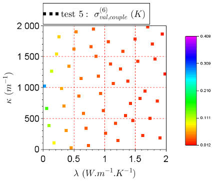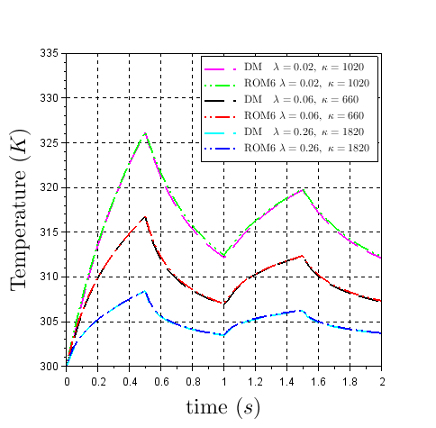 Pour l’identification des modèles réduits paramétriques, non-linéaires par rapport à λ et κ et linéaires par rapport à ϕ(t) lorsque λ et κ sont fixés, un créneau de densité de flux de chaleur ϕ(t) a été appliqué au MD pour 100 couples (λ, κ) indiqués sur la Figure 2 (points rouges). Les données de sortie sont les 100 évolutions de température correspondantes au centre de la face avant de l’échantillon (point d’impact du laser), calculées avec le MD. Une série de MR d’ordre m = 1 à 6 a été construite à partir de ces données entrées-sorties. Afin de tester les MR construits, 50 autres couples (λ, κ) ont été utilisés (Figure 2, carrés noirs) et plusieurs tests de validation ont été réalisés avec des signaux de densité de flux ϕ(t) différents. La Figure 3 et la Figure 4 illustrent les résultats pour l’un des tests de validation et montrent que le MR d’ordre 6 permet de bien reproduire les températures calculées par le MD. Ces travaux ont fait l’objet d’un article de revue [2] et ont été inclus dans la thèse de Yang Liu (2019).