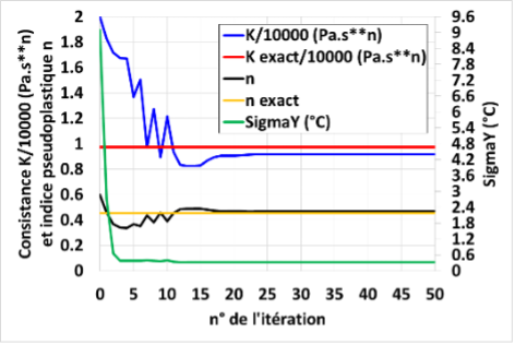 Une fois construits et validés, les MR peuvent être utilisés pour résoudre le problème inverse d’estimation de valeurs quelconques des paramètres (K,n) supposés inconnus, à partir d’un profil de température en sortie de conduite, simulé par le modèle de référence. Les MR d’ordre 3 à 5 ont permis d’estimer K et n avec quelques pourcents d’erreur en présence d’un bruit d’écart-type 0,3°C sur les températures, et ce quelle que soit l’initialisation de l’algorithme d’estimation [2]. La Figure 5 montre le profil de température en sortie simulé, sans et avec ajout de bruit. La Figure 6 illustre la convergence de l’estimation par le MR d’ordre 3.