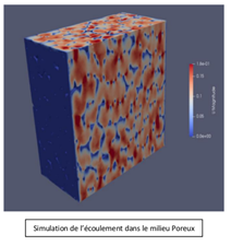 Fig. Image tomographique d’une mousse synthétique, maillage 3D obtenu avec AVIZO et champ d’écoulement simulé avec OpenFOAM (Ennazii et al., 2021). |