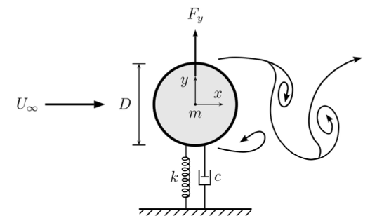 Flow-induced vibrations (FIV) over elastically mounted bluff-bodies can be observed in numerous applications such as the oscillation of power cables in the wind or offshore oil risers for example. Such mechanisms occur whenever a bluff body structure is immersed in a fluid stream. When vortex shedding frequency is close to the natural frequency of the bluff structure, large oscillations can occur and may result in potential damages. Such phenomena can, on the other hand, be considered for energy harvesting. Classsicaly, this fluid-interaction problem can be modelled as rigid damped oscillating body submitted to external forces as illustrated in Fig. 1.