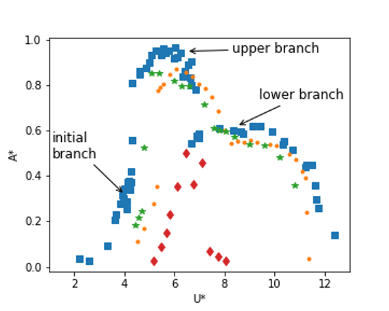 In this work, a rigid circular cylinder elastically mounted on an air-bearing system to achieve very low-friction is immersed in a low-velocity water channel (see Fig. 2). During the experiments, the location and speed of the cylinder are measured. A generator (DC motor) is used to simulate damping and stiffness coefficients without being mechanically intrusive. Under low damping and low mass ratio, elastically mounted cylinders are known to provide large oscillations over a limited range of flow velocities and to exhibit three branches of free vibrations as illustrated in Fig. 1. Different vortex modes can be observed in the cylinder’s wake depending on the response branch. The device under investigation has demonstrated results consistent with those of the literature as illustrated in Fig. 2. In particular, the added friction due to the generator is compensated thanks to a feedback law implemented and the free vibration response obtained without it is recovered. Flow visualisations with hydrogen bubbles and particle image velocimetry (PIV) have been performed to finely characterise the different vortex modes in the wake of the oscillating cylinder and to validate the proposed device as shown in Fig. 3. Being part of the project Maggie funded by the Région Nouvelle-Aquitaine, the following phase of the work will consist in the investigation of the interaction of two devices installed in a row. Active control based on machine learning algorithms are being implemented with objective to optimise the energy which can be potentially harvested from both devices. Optimisation of the energy harvested will be performed thanks to controlled rotation of the cylinder towards its main axis.