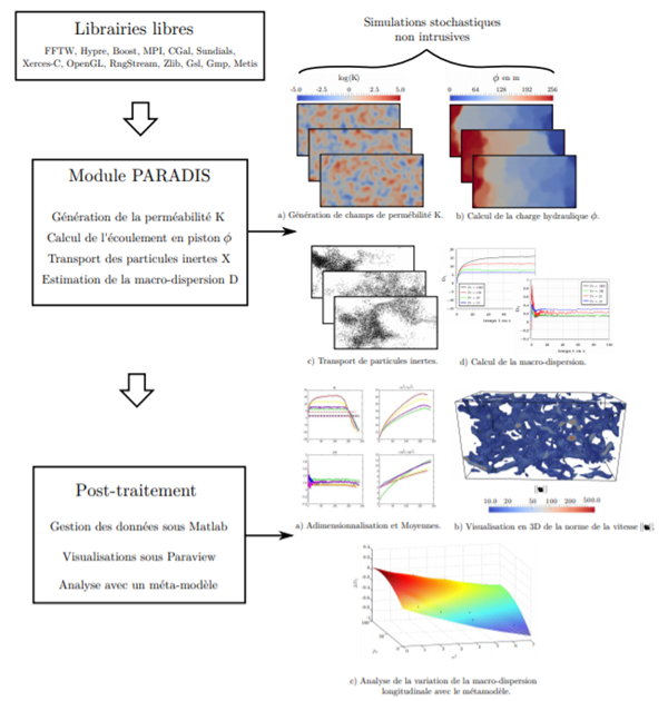Les formations géologiques sont des milieux poreux et/ou fracturés très fortement hétérogènes. Les écoulements sont alors caractérisés par une forte hétérogénéité de la vitesse d’écoulement. Cette hétérogénéité de l’écoulement perturbe le transport de particules, ne pouvant suivre l’équation classique de transport. L’hypothèse d’un régime fickien n’est plus valable. PARADIS est un modèle numérique parallélisé permettant de quantifier les lois de transport des particules inertes dans des milieux poreux très fortement hétérogènes. Il est basé sur une méthode stochastique non intrusive (méthode Monte Carlo) permettant de prendre en compte l’hétérogénéité de la conductivité hydraulique en tirant une série de champs aléatoires de la conductivité hydraulique. L’écoulement stationnaire en piston est résolu par la méthode des volumes finis. Le transport est résolu par une méthode "tracker random walker" corrigée pour la prise en compte de la discontinuité de la dispersion locale entre les strates d’une formation géologique. A l’aide du calcul intensif, l’extension 3D de ce code universitaire a permis de montrer d’une part que la macro dispersivité dans le sens parallèle à l’écoulement suit une loi quadratique en 2D et une loi exponentielle en 3D par rapport à la variance de la conductivité hydraulique et d’autre part que la macro dispersivité dans le sens perpendiculaire à l’écoulement est non nulle en 3D. Des modifications ont été apportées pour étudier le transport de particules réactives dans ces mêmes milieux poreux hétérogènes. Une adaptation de la méthode particulaire pour résoudre l’équation de transport du gradient de la concentration a été réalisée dans le cadre de la thèse d’A. Dartois (2013-2016), financée par l’ANR H2MNO4 (2012-2017), en collaboration avec Géosciences de Rennes. Le choix d’une méthode particulaire s’est justifié par le fait qu’elle est bien adaptée lorsqu’il existe des interactions locales entre les particules. Le choix d’écrire une équation de transport du gradient de la concentration s’est justifié par le fait que le gradient de la concentration permet de remonter directement au taux de réactivité des particules. Ce modèle numérique est actuellement utilisé dans une collaboration scientifique avec le groupe Milieux Poreux de l’Université de Buenos Aires (Argentine) pour étudier le transport de particules inertes dans des faciès plus ou moins connectés (Projet ECOS SUD France – Argentine). Dans le cadre de l’axe 3 "chimie verte et ressources durables" du programme P4 - ECONAT (CPER/FEDER 2015-2020), des modifications ont été réalisées pour étudier l’effet des zones de contact entre les deux surfaces rugueuses d’une simple fracture sur le transport de particules inertes. Ces modifications ont été faites par M. Farhat, post-doctorant (2020) financé par ECONAT. Ces modifications consistaient à implémenter la simulation de l’écoulement de l’eau dans le plan de la fracture. Pour cela, une approximation de Reynolds a été appliquée. Le gradient de l’ouverture de la fracture est supposé être assez faible pour considérer l’écoulement dans le plan de la fracture comme un écoulement de Poiseuille. Ainsi, le problème de l’écoulement de l’eau est considéré comme 2D où l’estimation de la vitesse moyenne est faite à partir de l’équation de continuité et de la loi de Darcy avec une conductivité hydraulique proportionnelle à l’ouverture de la fracture. La fracture est limitée par deux surfaces rugueuses non corrélées. L’ouverture de la fracture est donnée en estimant la distance moyenne entre les deux surfaces. La rugosité de chaque surface est caractérisée par une fluctuation aléatoire donnée par une fonction de corrélation spatiale, gaussienne ou auto-affine. Une quantification de l’impact des zones de contact entre les deux surfaces de la fracture simple sur la macro-dispersion a pu être faite. Cette étude paramétrique a montré qu’en perturbant l’écoulement, les zones de contact engendraient une dispersion additionnelle. Cette modélisation numérique a soulevé une question sur la prise en compte de la dispersion de Taylor-Aris dans les simulations numériques de Monte Carlo. Une nouvelle méthode "tracker random walker" permettant de considérer la dispersion de Taylor-Aris sans être obligé de simuler numériquement l’écoulement de l’eau en 3D est en cours de développement. La difficulté est de considérer la déformation des particules inertes induite par la variation de la vitesse dans la direction perpendiculaire au plan de la fracture. La solution est d’utiliser la notion de moments rendant possible de suivre la forme des particules inertes pendant leur transport dans la fracture.