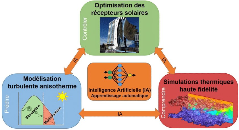 Le projet SOLAIRE propose d’optimiser les transferts thermiques en améliorant la compréhension du couplage entre turbulence et température, ainsi qu’en développant des stratégies de contrôle de la turbulence de proche paroi. L’objectif visé est d’étudier les transferts thermiques intenses en régime turbulent des Récepteurs Solaires (RS) et d’intensifier les transferts de chaleur grâce aux outils de l’apprentissage automatique.