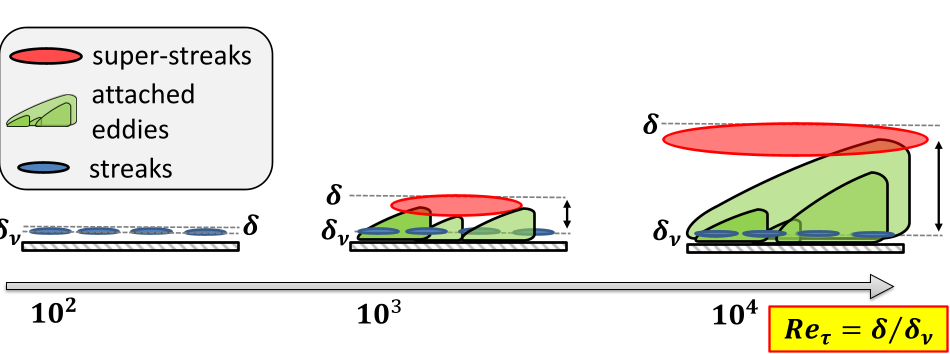 A conceptual representation of the boundary-layer ``zoology'' as the Reynolds number rises is conveyed by Fig. 2. Streaks, attached eddies and super-streaks are represented by blue ovals, green triangles and larger red ovals, respectively. The streaks depend on the viscous scales. In contrast, the super-streaks scale with the thickness of the boundary layer and the outer mean velocity. Essentially, as the Reynolds number increases, the outer motions become progressively stronger and so does their influence on the near-wall structures. Simultaneously, the range of attached eddies increases, with the hierarchy of eddies becoming more richly populated.