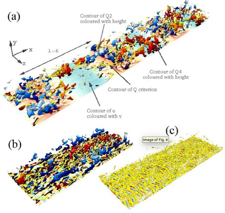 Turbulence within a wall-bounded flow, although emphatically chaotic, has some coherent structural components that are of major influence on the momentum‐mixing process and consequently to the drag and heat exchange. First, it is well established, both from simulations and experiments, that the highly‐sheared viscosity‐affected near‐wall layer is characterised by a quasi‐organised streaky structure -- collectively referred to as "streaks" -- formed by a spanwise, quasi‐regular, elongated, high‐ and low‐velocity regions. These are associated with quasi‐streamwise vortices that cause a lift up of low‐velocity fluid and a draw-down of high‐speed fluid. These turbulent structures occur during transition from laminar to turbulent conditions, in which case the spectrum of their scales is very narrow. Studying transitional phenomena is relatively simple, requiring modest resources, when compared to flows that are fully turbulent and feature a wide spectrum of scales. Therefore, the nature of transitional flow, from laminar to turbulent, is fairly well understood, at least for incompressible flows. However, fully turbulent flows at high Reynolds numbers pose far greater challenges.