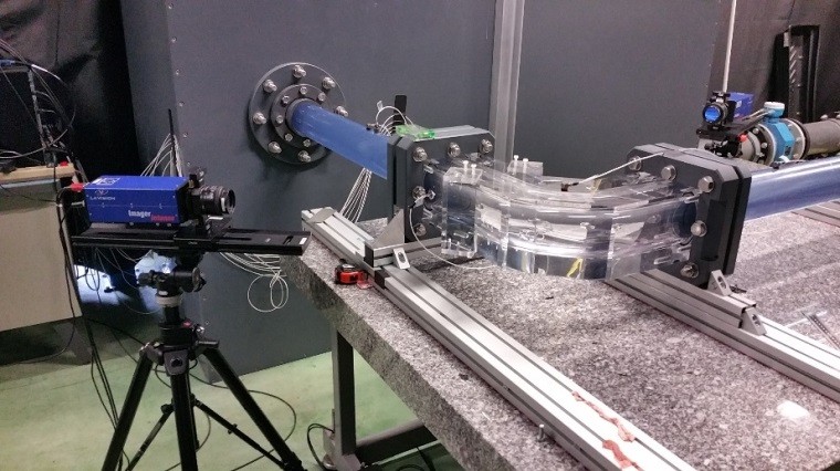 Cette installation hydrodynamique est modulable et permet à partir d’un réservoir de 6 m3 et d’une pompe d’installer différentes types de veine pour des mesures sur des singularités telles un coude ou des mesures autour d’échangeur.