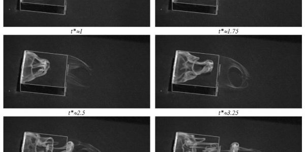 Le montage expérimental utilisé pour étudier la naissance d’écoulement. Ce dispositif expérimental est composé d’une cuve octogonale, verticale, de section utile 100 cm x 100 cm environ et de hauteur 150 cm composée en panneaux d’altuglass d’épaisseur 3 cm. , d’un chariot mobile sur lequel sont fixés le système d’éclairage, le(s) système(s) de prise de vues et la potence servant de support de fixation de maquette, d’un système mécanique fixe composé de deux rails verticaux rectifiés permettant la translation de la partie mobile du montage et d’un électro-aimant permettant de solidariser (et désolidariser) les parties fixe et mobile du montage. La vitesse de descente du chariot mobile est régulée par une circulation d’huile en circuit fermé au sein d’un vérin amortisseur pour une gamme de 2 à 20 cm/s. Cette vitesse peut être ajustée au moyen de la viscosité de l’huile contenue dans le vérin, du débit de fuite réglé grâce à une série d’ajutages et d’un jeu de contrepoids.
