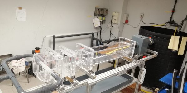 Cette veine hydrodynamique de faible longueur utile permet de visualiser et mesures des écoulements à faibles nombres de Reynolds. Comme elle est modulable, des études très différentes sont réalisées comme l’interaction entre un jet pulsé (ou non) débouchant dans un écoulement transverse, l’érosion de sédiments cohésifs, l’étude dans des faisceaux de crayon etc …. Les activités sont menées sur des projets académiques (FP7 Afdar) ou plus appliqués (CEA, ESA, ..)