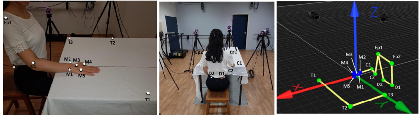 Les mouvements enregistrés par capture de mouvement se déclinent en quatre familles comme suit : main-bouche, main-tête, main-poignet et main-objet. Pour chaque famille de mouvement l’enregistrement s’est focalisé sur la position et l’orientation du membre supérieur.