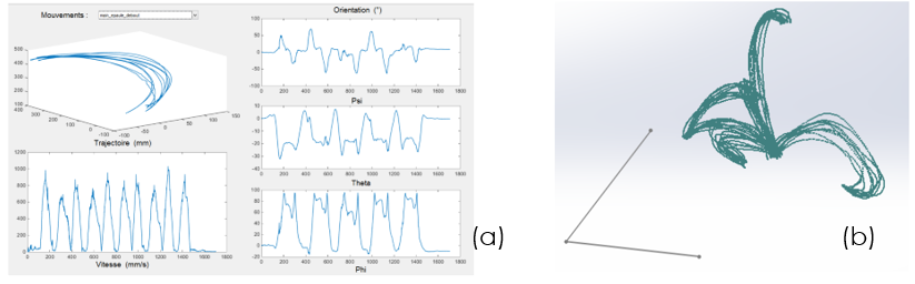 Figure 2 : (a) Interface de calcul des vitesses et des orientations - (b) Trajectoire du centre de la main.
