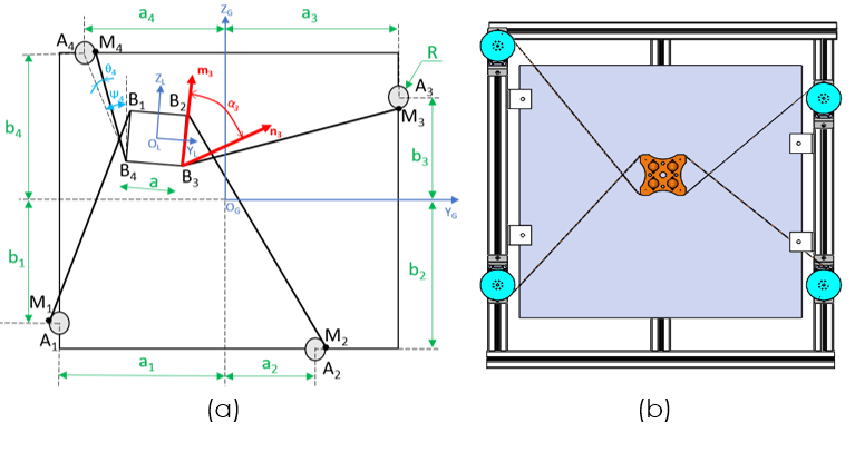 Figure 1. Robot à câbles plan : (a) paramétrage (b) modèle CAO.
