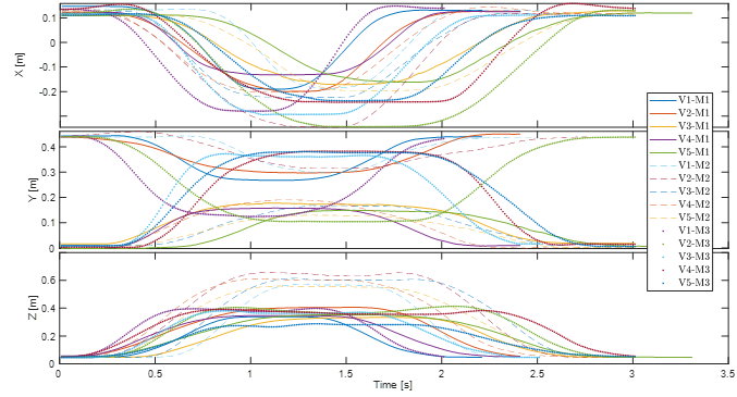 En exploitant les résultats de la capture de mouvement réalisée durant la première année, une étude comparative a été effectuée dans le but d’identifier une possible similitude entre les trajectoires. Ces dernières sont extraites des mouvements enregistrés pour chaque volontaire et caractérisés par des paramètres cinématiques, notamment les positions des articulations et les orientations des segments du membre supérieur. L’ensemble des trajectoires ont été comparées en utilisant la méthode d’analyse de la variance « ANOVA » et la méthode Tukey afin d’identifier les paramètres derrière cette différence. En résultat de cette analyse, on a conclu que chaque patient admet une trajectoire propre à son mouvement avec un degrés de variance proche de 5% par rapport aux trajectoires des autres sujets. Cette variabilité inter sujet est encore plus importante au niveau des orientations.
