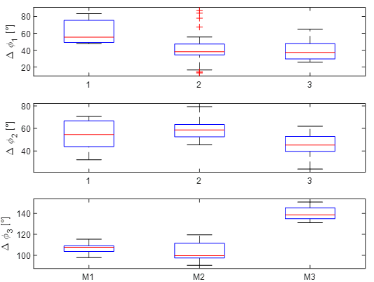 Figure 3. Plages de variation des 3 angles de rotation calculées pour les 3 mouvements (M1: main-bouche, M2: main-tête, M3: main-épaule).