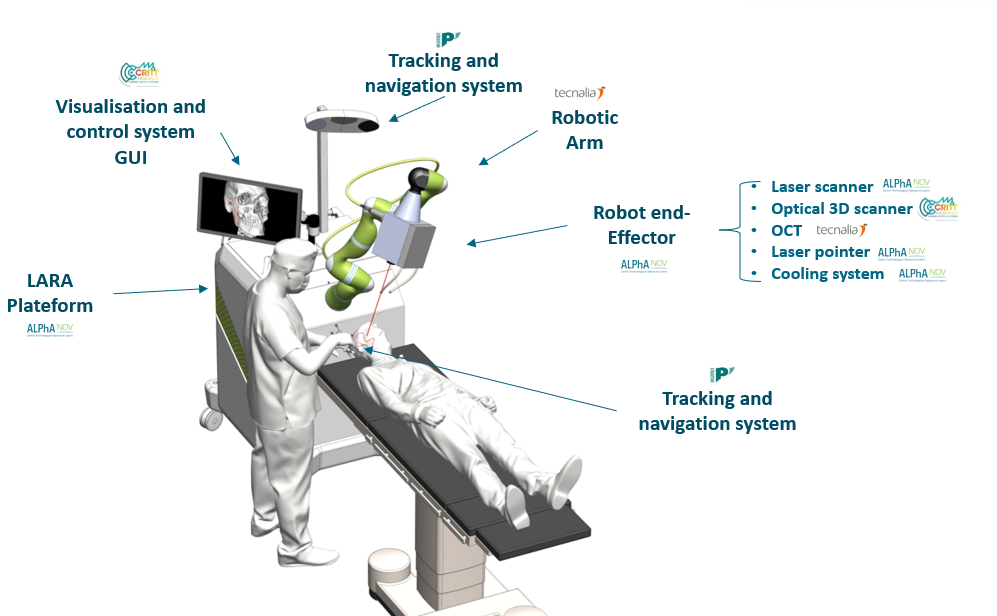 L’objectif du projet LARA (LAser Robotic Applications : Robot chirurgical pour la découpe osseuse par Laser fs en chirurgie cranio-maxillo-faciale) est la réalisation d’un dispositif médical de chirurgie robotique qui donnera au chirurgien la possibilité d’avoir une main augmentée, capable d’exécuter des gestes difficiles avec une finesse et une précision hors norme. Cette plateforme robotisée fonctionnera dans une configuration collaborative où le chirurgien définira pré et per-opératoirement la trajectoire 3D de découpe qui sera exécutée de manière autonome et conforme par le robot sans les tremblements ou les imperfections du mouvement humain.