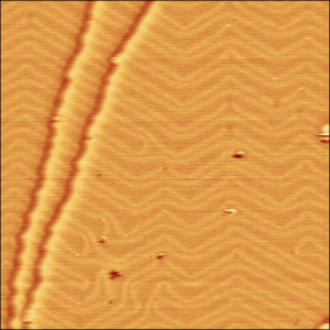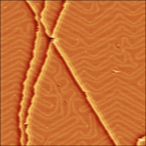 Image STM de l'évolution de la reconstruction en chevrons après apparition d'une trace de glissement dûe à une déformation uniaxiale